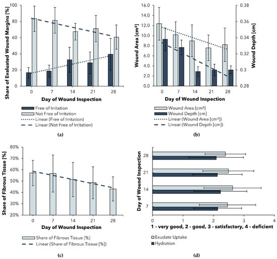 Selected results with respect to (a) wound area and wound-depth progression, (b) share of non-irritated wound margins, (c) share of fibrous tissue, as well as (d) exudate update and hydration are shown in Figure 1.