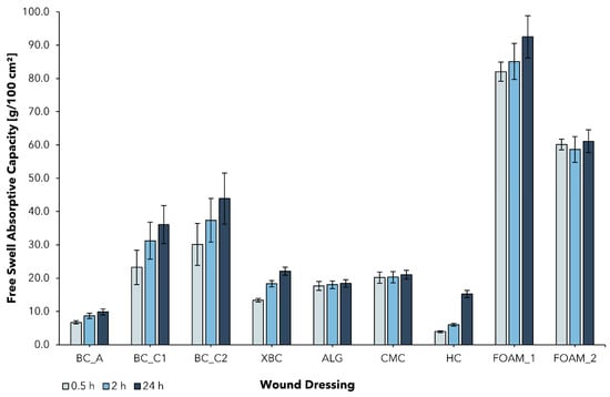 Although a moist healing environment is widely accepted as beneficial for successful wound healing and represents the standard for modern wound management, an excess of exudate can lead to wound complications and skin deterioration (e.g., irritation, maceration) [57,58]. In contrast to acute wounds, exudate in chronic wounds differs in its composition and has been shown to slow down cell proliferation, interfere with growth factor availability, and lead to successive degradation of the extracellular matrix [24,57]. To maintain an optimal moisture balance, a dressing must be able to absorb excess exudate and hydrate the wound at the same time. In order to compare the BC-based wound dressings, the free swell absorptive capacity according to EN 13726-1:2002 was determined for BC_A, BC_C1, BC_C2, XBC, and five different commercial wound dressings that represent a variety of commonly used options for the treatment of chronic wounds in Germany (Figure 3).
