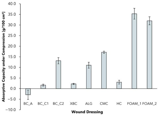 Negative AC0.5 in the case of BC_A can be explained by the fact that the material is already saturated with moisture, which is partly pressed out of the dressing by mechanical force. Looking at the BC-based wound dressings, BC_C2 performed best in terms of absorptive capacity, whereas BC_C1 and XBC lost most of their absorptive capacity. The reduced AC, especially of BC_A, should therefore be considered when treating chronic wounds that require compression therapy. With regard to that application, foam and hydrofiber dressings perform well in particular, but dressings such as BC_C2 with an increased solid content also show promising results.