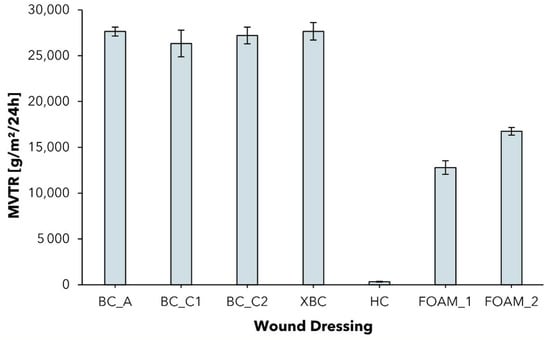 In the case of the contact with vapor method, the MVTR values obtained were in a broad range. Hydrocolloid dressing (HC) showed the lowest MVTR of 98 ± 5 g/m2/24 h, and can, therefore, be categorized as an occlusive dressing (MVTR < 300 g/m2/24 h [5]). The low MVTR can be explained by their composition of an outer layer as being a polymeric film, which holds a layer of absorbent hydrocolloids such as sodium carboxymethyl cellulose and gelatine as well as adhesives and gelling agents [32,33]. Occlusive dressings are suited for use on low or no-exuding wounds to keep a moist wound environment, but can lead to periwound skin maceration and dressing leakage on wounds with higher levels of exudation and are not recommended to be used on infected wounds [5,28,71,72].