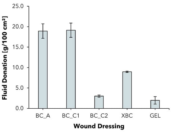 In a comparison of the tested moisture-donating commercial wound dressings, BC_A showed the highest FD of 18.9 ± 1.8 g/100 cm2, whereas the FD was remarkably lower for XBC with 9.0 ± 0.2 g/100 cm2 (Figure 6). The difference in FD between the BC dressings is probably partly due to the differing overall water content (BC_A > 98%, XBC > 96%). The gel dressing Suprasorb® G (GEL) consists of an acrylic polymer-based hydrogel with a water content of ~70% [76] and consequently showed the lowest FD of all tested samples with 2.0 ± 0.9 g/100 cm2. Considering the experimental dressing samples BC_C1 and BC_C2, the reduced water content of BC_C2 also correlates with a low FD capability. It stands out, however, that the modification in the case of BC_C1 did not lead to a reduction in the FD; the dressing performed similarly to BC_A in the experiment. Although this outcome seems contradictory at first, a possible rationalization could be that BC_C1 features not only an increased solid content but also a higher overall mass per area, whereas the absolute amount of water is comparable to that of BC_A. Taken together, these findings suggest that BC_C1 is as equally suited as the commercial dressing BC_A for the external hydration of a dry resp. low-exuding wound maintaining a suitable moist environment for successful wound healing, whereas the higher absorption capacity also suggests application on medium- to higher-exudation wounds.