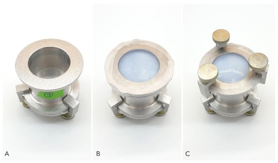 Standard Paddington cup method used to determine moisture vapor transmission rate (MVTR) of different wound dressings. (A) Paddington cup with defined orifice of 10 cm2 filled with deionized water; (B) Dressing sample placed over the orifice secured with clamping plate and sealed with impermeable film to prevent evaporation through the edges; (C) Final setup for measuring MVTR; fixation of the setup with screw clamps.