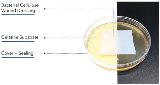 The wet dressings XBC, BC_A, BC_C, and GEL were compared regarding their fluid donation abilities using a method based on EN 13726-1:2002 part 3.4. Briefly, 35.00 g of gelatin powder was suspended in 65.00 g Test Solution A and incubated for 12 h at 60 °C until completely dissolved. An amount of 30 g of gelatin solution was poured into a petri dish of 90 mm diameter. The petri dishes were closed, sealed tightly, and incubated for 3 h at 25 °C to allow gel-forming (Figure 8).