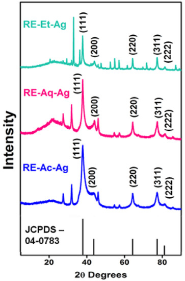 XRD patterns of RE-Ac-Ag, RE-Aq-Ag, and RE-Et-Ag nanoparticles.
