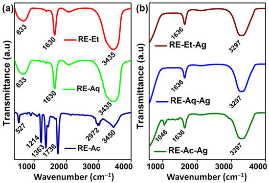 FTIR spectrum of plant extracts: (a) RE-Ac, RE-Aq, and RE-Et; (b) AgNPs RE-Ac-Ag, RE-Aq-Ag, and RE-Et-Ag.
