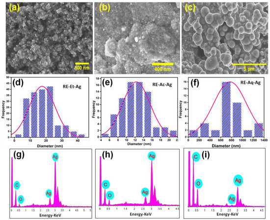FESEM micrographs of AgNPs: (a) RE-Et-Ag, (b) RE-Ac-Ag, and (c) RE-Aq-Ag. (d–f) Average particle size of RE-Et-Ag, RE-Ac-Ag, and RE-Aq-Ag. (g–i) EDS spectrum of RE-Et-Ag, RE-Ac-Ag, and RE-Aq-Ag.