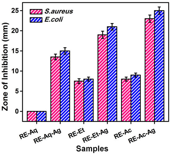 AgNPs with different sizes were tested by the well diffusion method for their inhibitory effect against E. coli and S. aureus bacterial strains. The antibacterial experiments reveal that all three samples have strong antibacterial activity against both bacteria; however, the obtained zone of inhibition values showed size-dependent activity, as shown in Figure 4. Additionally, the lower amount of Ag in the sample RE-Aq-Ag may have affected its bactericidal ability. These findings reveal that the smaller-sized AgNPs obtained from the solvent acetone (RE-Ac-Ag) and ethanol (RE-Et-Ag) have greater inhibitory efficacy than the water-derived AgNPs (RE-Aq-Ag). The current study demonstrated that AgNPs with sizes of 12 nm (RE-Ac-Ag) and 18 nm (RE-Et-Ag) have zone of inhibition values of 25 and 21 mm against E. coli and 23 and 19 mm against S. aureus, respectively. In the case of larger-sized (770 nm) AgNPs (RE-Aq-Ag), the antibacterial activity against E. coli and S. aureus is determined to be 15 and 13.5 mm, respectively. The observed changes in the antibacterial activity can be attributed to the size variation of the nanoparticles and the percentage of Ag, as well as the abundant availability of the functional groups of RE molecules extracted using acetone and ethanol, which are found to be responsible. In addition, the phytochemicals facilitated the ability to produce more reactive oxygen species (ROS), which are then used to inhibit bacterial growth [26]. This also demonstrated that the effect of nonaqueous solvents on the surface chemistry of the AgNPs produced improved their antibacterial capabilities by allowing them to readily interact with the bacterial nucleus, resulting in the highest interaction of the nanoparticles with the bacteria for efficient killing. For instance, Loo et al. (2018) synthesized AgNPs using aqueous extracted tea leaves, and the antibacterial activity against E. coli was found to be 15 mm. Likewise, Ahmed et al. (2016) synthesized AgNPs using aqueous leaf extract of Azadirachta indica. The antibacterial activity results against E. coli and S. aureus were determined to be 9 mm for both bacterial strains [19]. Previous literature has also suggested that nanoparticles exhibit size-dependent antibacterial action. Smaller particles have shown stronger antibacterial action due to their better capacity to penetrate bacteria. Smaller AgNPs have a superior surface area than larger bacteria, resulting in an increased antibacterial action. The results showed that AgNPs are more harmful to E. coli than to S. aureus. This might be related to changes in the rate of diffusion, structure of the cell, cell metabolism, and surface interaction of nanoparticles with microorganisms [27].