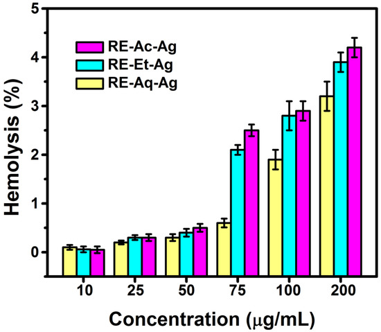 The size-dependent hemolytic behavior of AgNPs was evaluated at concentrations ranging from 10 to 200 µg/mL (Figure 5). From the results, it is observed that the samples RE-Et-Ag and RE-Ac-Ag demonstrated less than 2% hemolysis until 50 µg/mL, indicating that the materials are totally nonhemolytic. However, at concentrations from 75 µg/mL to 200 µg/mL, the hemolytic percentage is around 2 to 5%, indicating that the materials show slight hemolytic action at these doses. The sample RE-Aq-Ag is found to be nonhemolytic up to 100 µg/mL, but at 200 µg/mL, it displays mildly hemolytic activity. The results show that AgNPs with smaller sizes had higher hemolytic activity than AgNPs with larger sizes. Further, the results obtained suggest that the hemolytic effect is concentration dependent. According to the literature, smaller nanoparticles are more harmful than the bigger particles because they can readily breach the membrane due to their larger surface area and may powerfully interact with biomolecules [28,29]. Chen et al. (2015) observed size-dependent hemolytic activity of AgNPs with sizes of 15, 50, and 100 nm against fish RBCs. The results show that nanoparticles with a size of ~15 nm have a stronger capacity to cause hemolysis and membrane damage than nanoparticles with sizes around 50 and 100 nm. It can be stated that such hemolytic behavior caused by AgNPs should be ascribed to the nanoparticle’s direct contact with the RBCs, which results in the generation of oxidative stress, membrane damage, and, ultimately, hemolysis. According to the findings, the particle size of AgNPs has a significant impact during their interaction with RBCs [30].