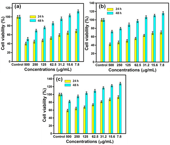 The experiment was conducted to examine the cytocompatibility of the prepared AgNPs. MG63 cell lines were obtained from the National Centre for Cell Sciences (NCCS, Pune). The culture was maintained in a humid atmosphere of 50 g/mL CO2 at 37 °C using Dulbecco’s modified Eagle’s medium (DMEM) with 10% fetal bovine serum (FBS), penicillin (100 U/mL), and streptomycin (100 g/mL). In 24-well plates, MG63 cells (approximately 1105/well) were seeded and incubated at 37 °C in a CO2 atmosphere. The AgNPs prepared were of various concentrations, such as 7.8, 15.6, 31.2, 62.5, 125, 250, 500, and 1000 µg/mL, and incubated for 24, 48, and 72 h at 37 °C. Then, the cells were treated for 4 h with 3-(4,5-dimethylthiazol-2-yl)-2,5-diphenyl tetrazolium bromide (MTT). To dissolve the formazan crystals, 1 mL of dimethyl sulphoxide (DMSO) was added, and OD values were recorded using an ELISA reader (Bio-Rad 680, USA) at 570 nm. The assay was carried out in triplicate, and the percentage of viable cells was estimated using the following formula: