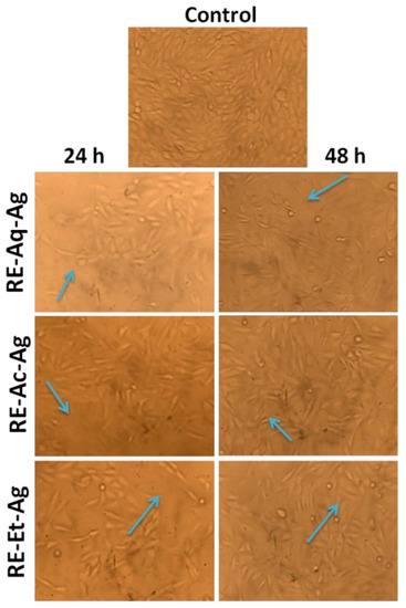 MTT assay was carried out to assess the influence of AgNPs on the proliferation rate of MG63 cell lines (Figure 6). The cells were cultured for 24 and 48 h with varied sizes of AgNPs at varying concentrations, and the viability of cells was determined by plotting the graph of cell proliferation efficiency. The findings clearly demonstrated the size-dependent cytotoxic activity, with the samples RE-Et-Ag and RE-Ac-Ag exhibiting cytotoxic behavior at 125 µg/mL and RE-Aq-Ag exhibiting cytotoxic behavior at 500 µg/mL. Furthermore, the obtained data also revealed that the AgNPs behave in a concentration-dependent way; as the concentration increased from 7.8 to 500 µg/mL, the viability of all samples reduced. Cell viability dropped after 24 h of incubation for the samples RE-Et-Ag and RE-Ac-Ag. In contrast, after 48 h of incubation, the cell proliferation rate in lower concentrations increased above the control. This might be attributable to AgNPs achieving the optimal conditions after extending the incubation time, which increased the rate of cell growth [31]. Optical microscopic images (Figure 7) also revealed similar results, demonstrating that cell proliferation is visible after 48 h as compared to 24 h. Soares et al. (2016) studied the size-dependent cytotoxicity of AgNPs using the sizes of 10 and 50 nm. According to their findings, 10 nm AgNPs are more hazardous than 50 nm AgNPs. The data showed that nanoparticles impede lysosomal function, cause membrane damage, and cause neutrophils to undergo an oxidative burst. Wu et al. (2019) investigated the cytotoxicity of nanoparticles against B16 cells of different sizes, finding that nanoparticles as small as 5 nm were found in the cytoplasm and nucleus, whereas the larger nanoparticles (20, 50, and 100 nm) were found outside the cells. This might be owing to the ease with which smaller nanoparticles penetrated the cells, but bigger nanoparticles were exceedingly difficult to enter [32].