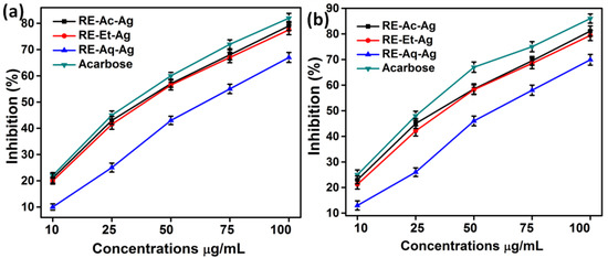 Alpha-amylase (α-amylase) and alpha-glucosidase (α-glucosidase) are enzymes that contribute to carbohydrate breakdown and glucose absorption. Inhibiting these two digestive enzymes suppresses starch breakdown and slows down the glucose release in the blood. AgNPs were incubated with α-amylase and α-glucosidase at various concentrations (10, 25, 50, 75, and 100 µg/mL), and acarbose was used as a control. Figure 8a,b shows that α-amylase and α-glucosidase were significantly inhibited in a dose-dependent manner. The percentage of inhibition is found to be increased with the increasing concentration of AgNPs. The IC50 values of α-amylase and α-glucosidase are determined to be around 50, 50, and 75 µg/mL for RE-Et-Ag, RE-Ac-Ag, and RE-Aq-Ag respectively. Thus, the results indicated that the AgNPs and acarbose show a significant inhibition of α-amylase and α-glucosidase. Likewise, Balan et al. (2016) reported the antidiabetic activity of AgNPs, with IC50 values of 54.56 µg/mL and 37.86 µg/mL for α-amylase and α-glucosidase, respectively. In another study, Saratalae et al. (2018) developed AgNPs using Punica granatum leaves and tested them for their antidiabetic activity. The IC50 values were found to be 65.2 and 53.8 µg/mL for α-amylase and α-glucosidase, respectively [17].