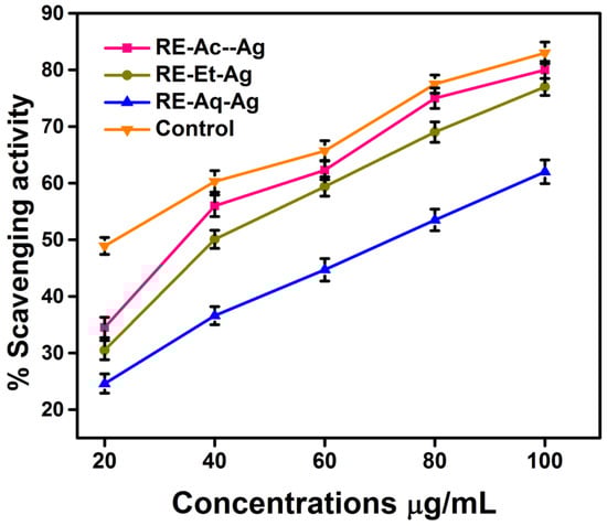 The capacity to scavenge free radicals is examined using the free radical compound DPPH. The scavenging ability is determined at various concentrations of AgNPs (20, 40, 60, 80, and 100 µg/mL) via the characteristic absorbance at 517 nm. The reduction in absorption indicates that the free radicals are being scavenged [22]. The findings, as depicted in Figure 9, suggested that the free radical scavenging efficacy of RE-Et-Ag, RE-Ac-Ag, and RE-Aq-Ag is size dependent. The IC50 values of DPPH inhibition were found to be ~40 µg/mL for RE-Et-Ag and RE-Ac-Ag and 60 µg/mL for RE-Aq-Ag. Additionally, increasing the concentration of the samples enhanced the scavenging efficacy of the AgNPs, as well as the activity of the positive control by 83, 80, 77, and 62% at 100 µg/mL for ascorbic acid, RE-Et-Ag, RE-Ac-Ag, and RE-Aq-Ag, respectively. According to the results, AgNPs with a lower size have a higher potential for scavenging than the larger nanoparticles. This might be related to the increased surface-to-volume ratio of the smaller AgNPs as compared to the larger-sized NPs, which essentially causes the particles to effectively interact and considerably inhibit the free radicals [17]. The lower percentage of Ag in the larger-sized sample could potentially be contributing to the lower DPPH activity. The findings show that smaller AgNPs have substantial antioxidant properties, which is important for biological applications.