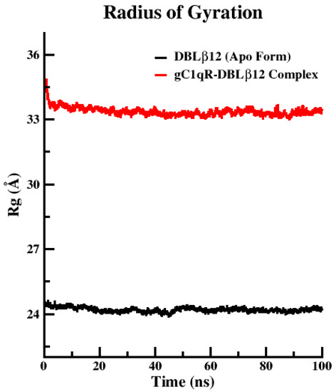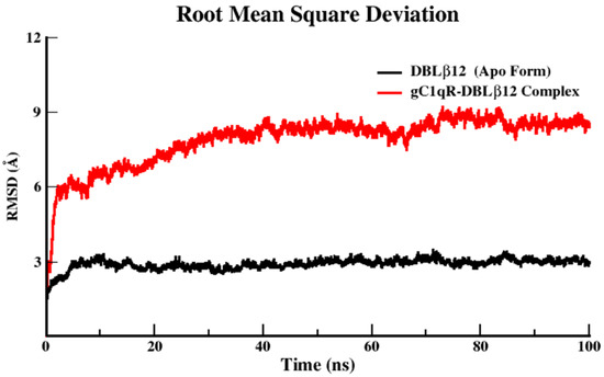 Molecular Dynamics (MD) simulation analysis is used as a tool to measure the stability, fluctuation, compactness, and conformational alterations of our proteins in apo and complexed states. MD simulation was done for the apo state of DBLβ12 and complexed state when DBLβ12 bound with gC1qR. These two Systems were used for assessment of apo and complexed state. The 100 ns MD production run of each system accomplished for the above-mentioned analytic parameters.