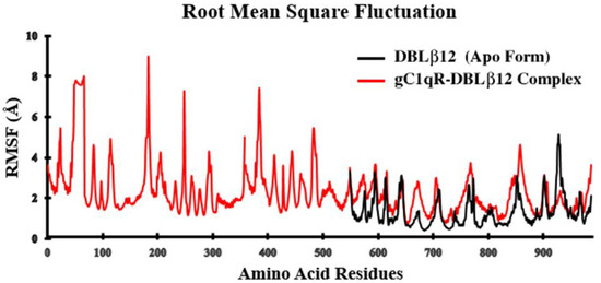 The root-mean-square deviation (RMSD) analysis of the backbone atoms of the uncomplexed DBLβ12 demonstrated a slight deviation with the value of 2.7–3 Å at 100 ns. While after complexation of DBLβ12 model with gC1qR, we observed a drastic deviation with increase RMSD value in the range of 6–8 Å. The relative deviation analysis elaborated that after 20 ns time of MD simulation, the DBLβ12 model showed noticeable stability with the decrease RMSD value of 0.3 Å. Figure 1 illustrates that the deviation in the apo state was quite stable and after complexation the deviating score inflated with the drastic alterations. Another MD simulation parameter root mean square fluctuation (RMSF) estimates the average fluctuation of the protein residues throughout all-atom based simulation. The RMSF was executed on the backbone Carbon atoms in both apo and complexation state. The RMSF analysis was depicted in Figure 2. The RMSF plot revealed that in the apo state, when the DBLβ12 domain didn’t bind to the human gC1qR, the conformation fluctuation was noticeably normal with the range of ±3–4 Å. While in the complexed state, the deviation peak was noted in the B chain of gC1qR trimer. It was evident from MD simulation analysis that the conformational and configurational changes occur when the DBLβ12 domain attract towards gC1qR, and the fluctuations tend to increase in the complexed state of the protein–protein interaction. In the RMSF plot, the amino acid residue starting from 1–544 corresponded to human gC1qR while 545–985 residues indicated the DBLβ12 domain. On the basis of fluctuations, it can be stated that gC1qR Chain B was strongly associated in the interface region as compared to Chain A and Chain C. The degree of fluctuation was noticeable at 545–630 residue during whole simulated trajectory analysis.
