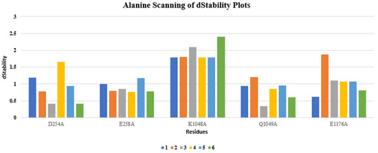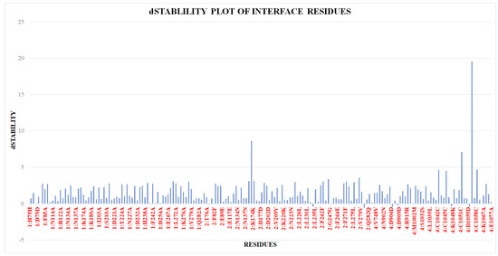 Alanine scanning mutagenesis is an in silico approach to estimate the role of specific residue in the stability of the protein–protein complex and the functional importance of these residues [19]. This technique calculates the relative affinity and stability of the mutant and correlate the wild type. The negative value of the stability indicates the more stability of the complex. Hence, a positive value of the dStability shows the importance of the particular residue in the interface region of the complex structure [20,21]. Alanine Mutagenesis studies was conducted using MOE analyse the role of specific amino acid in the stability of the DBLβ12 and gC1qR [19]. The crucial interface residues involved in the interface regions were identified for the gC1qR and DBLβ12 using dStability values as depicted in the Figure 4.