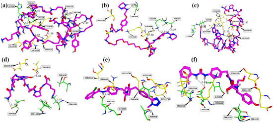 Molecular representation of the top-ranked PPI inhibitors against DBLβ12-gC1qR. (a–f) represents compound 1 to 6, respectively.