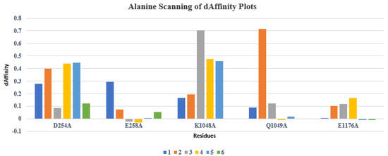 Alanine scanning using GBVI/WSA dG scoring function implemented in MOE was also performed on the top cherry hits bound DBLβ12-gC1qR complex one by one on the selected five residues. The resultant changes in the ligand binding affinities and complex stability were evaluated as shown in the Figure 7 and Figure 8. Among all the compounds, the 4, 5, and 6 compounds were found to perform better than compounds 1, 2 and 3. The affinity values of the 4, 5, and 6 compounds were found to be less positive than other compounds. Moreover, compound 6 was found to be best among all the selected compounds as it indicated more negative affinity values for the selected residues.