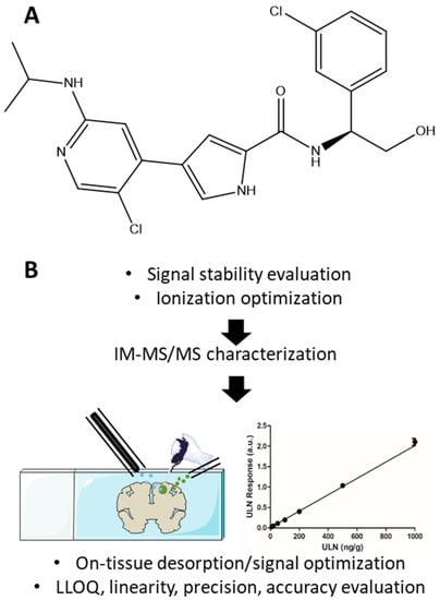Two prototypes were evaluated for the development of quantitative DESI-MS assays, using as a model the ERK inhibitor ULN (Figure 1A): a HP DESI sprayer and a Heated Transfer Line (see Section 4 and Section 4.6). The first phase of method development consisted of signal stability evaluation and ionization optimization (Figure 1B, see Section 4, Section 4.3, Section 4.5 and Section 4.6).