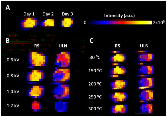 Optimization of the initial settings for DESI-MS analyses. Rhodamine C from a red staining marker (RS, m/z 443) and ulixertinib (ULN, m/z 433) were deposited on Aquarray superhydrophilic glass slides. (A) Signal stability was compared between images of RS acquired on three different days. (B) Different voltages were compared for RS and ULN analysis, both displaying the highest signal for a capillary voltage of 0.8 kV. (C) Different temperatures were tested for RS and ULN analysis, both displaying equal signals with any temperature.
