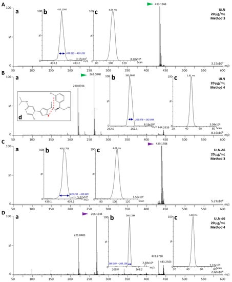 The quadrupole low mass (LM) resolution was set to 4.4 arbitrary unit (a.u.), to allow the selection of ULN and the ULN-d6 without losing sensitivity [].The standard energy value for fragmentation (32 eV) was verified to be optimal for ULN, i.e., to produce intense MS/MS fragments and weak intensity peaks of remaining parent ions.