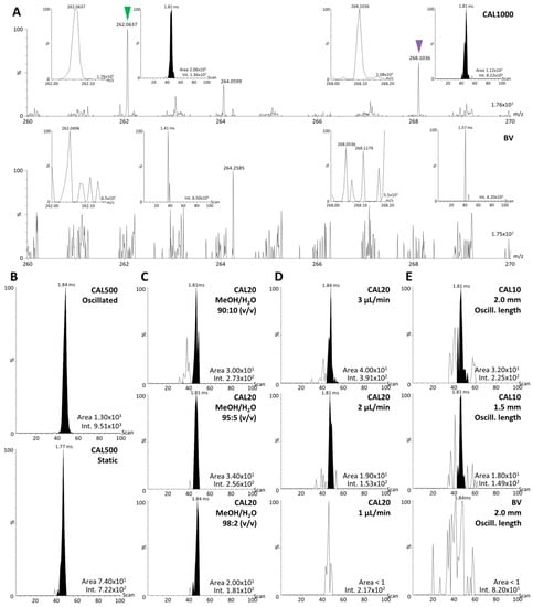 Aquarray DMA Slides G-dd-202 slides (Aquarray GmbH, Eggenstein-Leopoldshafen, Germany) containing 32 × 10 circle spots with 1414 µm diameter each were used for instrument calibration and an initial compound characterization. For instrument calibration, 3 µL of leucine enkephaline (Waters Corporation, Milford, MA, USA) at 400 ng/µL in ACN/H2O were deposited on a spot and analyzed by DESI-MS/MS with the parameters described below, defined after optimization. Acquisitions for mass calibration were performed in static profiling with oscillation, in TOF-MS/MS and sensitivity modes, over 60 s. To test the signal stability of the DESI-MS (Figure 1B), rhodamine C was deposited onto Aquarray spots by marking the surface using a red marker (Sharpie, Newell Brands, Atlanta, GA, USA). For ionization optimization and IM-MS/MS characterization of ULN and ULN-d6 (Figure 1B), 1 µL of the sub-stock solution described above was deposited onto Aquarray spots.