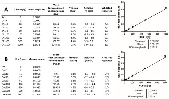 With the parameters optimized as described above, it was aimed to verify whether the source could provide satisfactory parameters for the creation of calibration curves in terms of linearity, precision, and accuracy with the LLOQ defined at 10 ng/g. According to regulatory guidelines defined by the US Food and Drug Administration (FDA), the European Medicines Agency (EMA), and the International Committee for Harmonization (ICH) [,,,], calibration curves should be computed using the simplest possible regression model and the selected model should be reproducibly fitting between batches. Precision between replicates should be <20% CV (coefficient of variation) for the LLOQ and <15% CV for all other calibration points, and accuracy of the back-calculated concentration of calibration points should be within a range of ±20% bias for the LLOQ and ±15% bias for all other calibration points. Obtaining calibration curves that fall within these ranges can be considered the ultimate proof of the reliability of an ion source for the development of quantification assays. Two batches were performed on different days in order to define whether calibration curves would meet regulatory guideline criteria. As an additional criterion of quality, a determination coefficient (R2) above 0.98 was defined as a satisfactory value for calibration curve linearity.