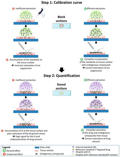 It is important to note that in the present study, we only focused on analytical aspects in order to define if the new DESI setup provides the requested performances of an ion source for drug quantification in tissue sections. In terms of assay development, additional steps will be necessary to define that the chosen sample preparation method is adequate for drug quantification, without creating artefacts. Dedicated methods will be necessary to verify the proper extraction of drugs from sections of dosed tissues. It was formerly demonstrated that the presented sample preparation method was ideal for the extraction of mebendazole from tissue sections using MeOH/H2O 1:1 (v/v) as a solvent mixture, as confirmed by comparison of MALDI-IM-MS/MS with liquid chromatography (LC)-MS/MS results []. However, using alternative solvents such as tert-butyl methyl ether led to interacting artefacts and underestimation of drug concentrations []. For the generation of calibration curves, standards and IS are deposited on tissue sections, while for dosed tissue sections only the IS is deposited on the tissue sections and ULN is extracted from the tissue. Inefficient extraction in dosed tissue would result in an underestimation of the amount of ULN, as illustrated in Figure 6. Great care must be taken in the choice of solvent to ensure that extraction of drugs from tissue sections is optimal, and strategies must be developed to prevent artefacts from excessive accumulation of the IS on the surface of dosed tissues. Finally, method validation will necessitate to develop dedicated quality control (QC) samples to evaluate mimetic recovery (QC MIM), i.e., the yield of solvent-based extraction from dosed tissues []. Similar to profiling assays, the same precautions should be observed in DESI imaging for drug quantification, especially because approaches to solvent-based deposition of compounds could lead to significant artefacts in extraction of drugs from dosed tissues []. DESI imaging mode would provide the ultimate and powerful combination of spatial resolution and in situ quantification. Besides improvement for robustness, the High-Performance DESI Sprayer was designed to obtain a sharper spray plume for higher spatial resolution in DESI imaging. However, spatial resolution is often balanced with signal quality and intensity in imaging MS. Adequate sample preparation and analytical settings will have to be finely optimized to reach the needs in terms of LLOQ and histological resolution, depending on the selected pharmacological application.