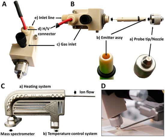Architecture of the High Performance (HP) DESI Sprayer and the Heated Transfer Line. (A) Outer view and (B) inner view of the HP DESI Sprayer showing the location of the emitter and the critical connections (H/V, gas and fluid inlet line). (C) Heated Transfer Line showing the heating system and the position of the temperature control system. (D) Complete setup installed on the mass spectrometer.