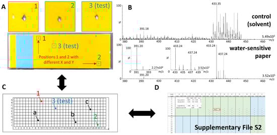 The desorption of the material constituting the water-sensitive paper created a strong signal for a parent ion at m/z 433.24 and at m/z 391.19 for a fragment ion, as shown in Figure 8B. Water-sensitive paper was then also used for signal optimization, especially for the adjustment of X and Z positions of the motion plate that are relevant for optimum signal intensity, as described below.