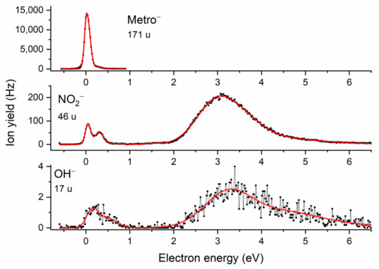 - Ribar, A.; Fink, K.; Probst, M.; Huber, S.E.; Feketeová, L.; Denifl, S. Isomer Selectivity in Low-Energy Electron Attachment to Nitroimidazoles. Chem. Eur. J. 2017, 23, 12892–12899. [Google Scholar] [CrossRef]