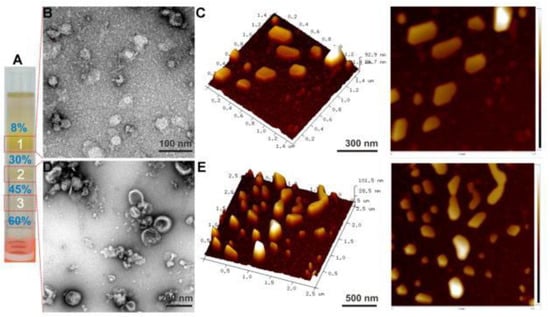Ginger derived EVs. Sucrose gradient ultracentrifugation depicts three bands (A). Visualization and characterization of ginger derived EVs using Transmission Electron Microscope (TEM) (B,D) and atomic force microscope (AFM) (C,E) are shown. Reproduced with permission from ref. [33].