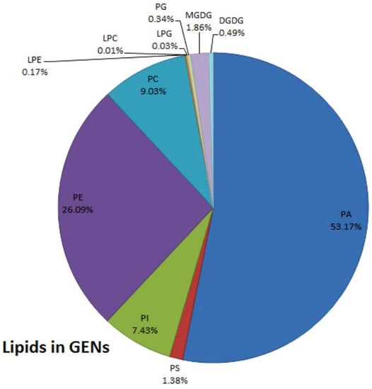 Synopsis of the putative lipid species in grape derived EVs; reported as percent of total grape derived EVs lipids, attained by sucrose gradient ultracentrifugation and differential centrifugation: LPC, lyso-phosphatidylcholines; LPE, lyso-phosphatidylethanolamines; LPG, lyso-phosphatidylglycerol; MGDG, monoglycerol; DGDG, diglycerol; PA, phosphatidic acids; PS, phosphatidylserine; PI, phosphatidylinositol; PE, phosphatidylethanolamines; PC, phosphatidylcholines; PG, phosphatidylglycerol. Reproduced with permission from ref. [35].