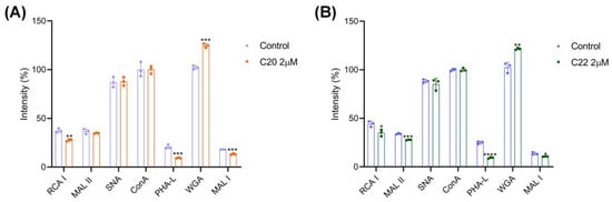 Lectin staining analysis of cell surface glycosylation. (A,B) Lectin staining of HepG2 cells after treatment with C20/C22 at a concentration of 2 μM for 48 h (n = 3). The displayed data correspond to the mean ± SD of three separate experiments. The p-value was analyzed by Student t-test using GraphPad Prism version 8.00. * p < 0.05, ** p < 0.01, *** p < 0.001 and **** p < 0.0001 vs. control group.