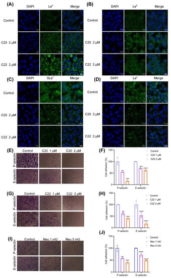 C20 and C22 modified cell surface glycosylation and inhibited the interactions between HepG2 and E/P-selectin. HepG2 cells were treated with 2 μM C20/C22 for 24 h, and the expression of Lewis oligosaccharides on the surface of HepG2 cells was detected by immunofluorescence assays: (A) Lea, (B) Leb, (C) SLex, and (D) Ley. Scale bars, 10 µm. Different concentrations of C20, C22, and neuraminidase were used to treat cells for 24 h, and then 2 × 104 live cells/well were taken and added to the P-selectin- and E-selectin-coated ELISA plates (n = 3). (E,F) The effect of treatment with 1 and 2 µM C20 on cell adhesion to P- and E-selectin. (G,H) The effect of treatment with 1 and 2 µM C22 on cell adhesion to P- and E-selectin. (I,J) The effect of 1 and 5 mU neuraminidase on cell adhesion to P- and E-selectin. Scale bars, 50 µm. The displayed data correspond to the mean ± SD of three separate experiments. The p-value was analyzed by one-way ANOVA followed by Tukey’s test using GraphPad Prism version 8.00. ** p < 0.01, *** p < 0.001, and **** p < 0.0001 vs. control group.