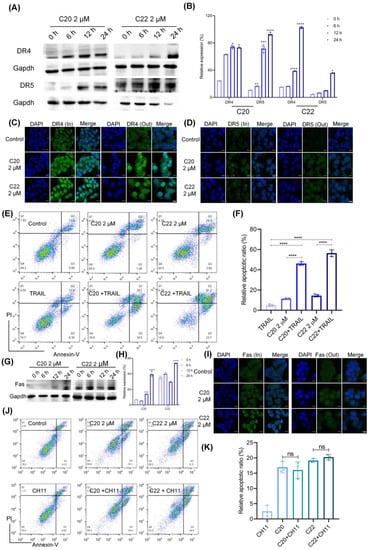 Cells pretreated with C20/C22 for 24 h were continuously incubated for 24 h in the presence of 30 ng of TRAIL per well, and the apoptotic cells were detected by flow cytometry. Without the pretreatment with C20/C22, no significant difference was observed between the TRAIL-treated group and the control group (Figure 5E,F). In contrast, TRAIL-induced apoptosis was increased by 40% among the cells pre-treated with 2 μM C20/C22 in comparison with the TRAIL-treated group. C20/C22 treatment also led to an increased expression of Fas (Figure 5G,H). The immunofluorescence results revealed that the Fas receptor only increased intracellularly, but its cell surface distribution was not significantly affected compared with the untreated cells (Figure 5I). Cells treated with C20/C22 showed no significant alterations in apoptosis after the addition of anti-Fas antibody (CH11) in comparison to the cells treated with CH11 alone (Figure 5J,K).