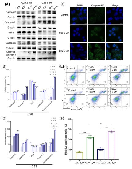 Treatment with C20/C22 led to increased proapoptotic protein expression and a caspase cascade response. (A–C) WB analysis of the antiapoptotic and caspase proteins in HepG2 cells treated with C20/C22 at 2 μM for 0, 6, 12, and 24 h. The reported values correspond to the mean ± SD for three independent experiments. (D) Immunofluorescence assays employed to determine the expression of caspase3/7 in cells with indicated treatments. Scale bars, 10 µm. (E,F) Apoptotic cells detected by flow cytometry after indicated treatments (n = 3). The p-value was analyzed by one-way ANOVA followed by Tukey’s test using GraphPad Prism version 8.00. ** p < 0.01, *** p < 0.001, and **** p < 0.0001 vs. 0 h/control group.
