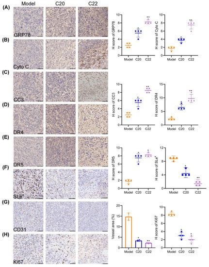 Immunohistochemical analysis of tumor sections from model group and the groups administrated with C20/C22. (A) GRP78 staining tumor sections (n = 4). (B) Cyto C staining tumor sections (n = 4). (C) CC3 staining tumor sections (n = 4). (D,E) Death receptors DR4 and DR5 staining tumor sections (n = 4). (F) SLex staining tumor sections (n = 4). (G) CD31 staining tumor sections (n = 4). (H) Ki67 staining tumor sections (n = 4). Scale bars, 50 μm. Data are presented as the mean ± SD. The p-value was analyzed by nonparametric Dunnett’s test using GraphPad Prism version 8.00. * p < 0.05, ** p < 0.01 treatment groups vs. model group.