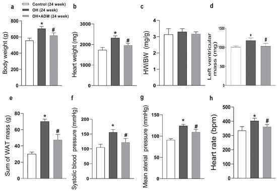 The anatomic data, systolic blood pressure (SBP), mean arterial pressure (g), and heart rate after 24 weeks of high-fat diet (HFD) feeding. OH: obesity-related hypertension. BW: body weight (a). HW: heart weight (b). WAT: white adipose tissue. BW, SBP (f), and heart rate (h) were measured under conscious state. Left ventricular mass (d) was measured using the echocardiographic method. The inguinal, perirenal, epididymal, and mesenteric WAT weights were included in the sum of WAT mass (e). HW/BW (c) means the ratio between heart weight and body weight. Chronic adrenomedullin (ADM, 7.2 μg/kg/day, ip) administration was applied to OH rats for 4 weeks. The Control and OH rats were treated with saline (vehicle). n = 8 rats for each group. Values are presented as mean ± SEM. * p < 0.05 versus Control (C), and # p < 0.05 versus OH.