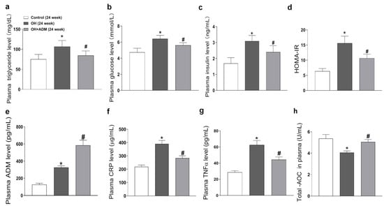 The effects of ADM on plasma metabolic parameters, inflammation markers including C-reaction protein (CRP) and TNF-α, and total antioxidant capacity (T-AOC). The plasma levels of triglyceride (a), glucose (b), insulin (c), ADM (e), CRP (f), TNF-α (g) and T-AOC (h) were determined by kits referring to the instructions. At the end of 24 weeks, all rats fasted overnight, and about 1.5 mL of blood was collected from the tail vein. The glucose oxidase method was used to determine the plasma glucose level by using a kit (Jiancheng bioengineering, Nanjing, China). The triglyceride concentration was detected by colorimetric reaction using a kit (Jiancheng bioengineering, Nanjing, China). The enzyme-linked immunoassay (ELISA) method was used to detect the insulin level in plasma by using a kit (RayBiotech, Norcross, GA, USA). The HOMA-IR (homeostasis model assessment of insulin resistance) index was used to assess IR by using the formula: HOMA-IR = [fasting glucose (mmol/L) × fasting insulin (mIU/L)]/22.5 (d). n = 8 rats for each group. Values are presented as mean ± SEM. * p < 0.05 versus Control (C), and # p < 0.05 versus OH.