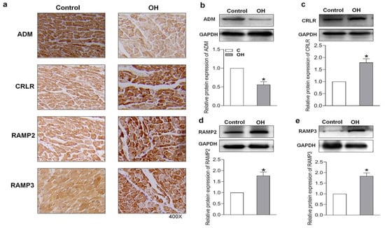 Immunohistochemistry was utilized to detect ADM and its receptor system expression in the hearts of the Control and OH rats. Primary antibodies (1:100), including ADM, CRLR, RAMP2, and RAMP3, and horseradish peroxidase-conjugated goat anti-rabbit antibody were used. A analytical reagent, 3,3-diaminobenzidine, was used to show the positive cells. Images were taken from a light microscope (BX-51, Olympus, Tokyo, Japan).
