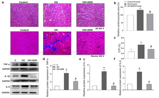 The effects of ADM on remodeling and inflammation in the heart. Representative sections showing the myocardial remolding observed under a microscope (200×). Hematoxylin-eosin (H&E) and Masson’s trichrome-staining (a), relative cardiomyocyte area (b), and the quantitative myocardial fibrosis analysis (c). The arrows indicate the collagen fibers. The typical pro-inflammatory cytokines TNF-α, IL-1β and IL-6 protein expressions (d–f) in the heart were determined by the Western blotting method. CVF: collagen volume fraction. n = 3–8 rats. The values are presented as mean ± SEM. * p < 0.05 versus Control (C), and # p < 0.05 versus OH.