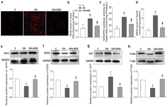 The effects of ADM on cardiac oxidative stress and Akt activation. DHE fluorescence staining for ROS evaluation (a), ROS level (b) and NADPH activity (c) examination by chemiluminescence method, MDA content (d) measurement by spectrophotometrical analysis and antioxidant enzymes including GPx1, SOD2, and CAT (e–g), and Akt phosphorylation (h) determination by Western blotting method. C, control; ROS, reactive oxygen species; NADPH, nicotinamide adenine dinucleotide phosphate; MDA, malondialdehyde; GPx1: glutathione peroxidase 1; SOD2, superoxide dismutase 2 (SOD2); and CAT, catalase. n = 3–8 rats. The values are presented as the mean ± SEM. * p < 0.05 versus Control (C), and # p < 0.05 versus OH.