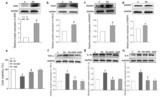 PA induced higher protein expressions of ADM and its receptor system than those in control H9c2 cells (Figure 6a–d). We wanted to further explore the roles and mechanisms of ADM in inflammation in cardiomyocytes. PA was used to mimic fatty acid stimulation and to verify the roles of ADM in cardiomyocyte damage induced by hyperlipidemia. ADM alone did not cause obvious effects on cell viability, but PA alone significantly decreased it. More importantly, ADM plus PA obviously improved cell viability in the H9c2 cells (Figure 6e). We also observed that ADM in H9c2 cells significantly decreased the protein levels of inflammatory cytokines TNF-α, IL-1β and IL-6 induced by PA (Figure 6f,g). These results confirmed the protective roles of ADM in fatty acid-induced cardiomyocyte viability and inflammation.