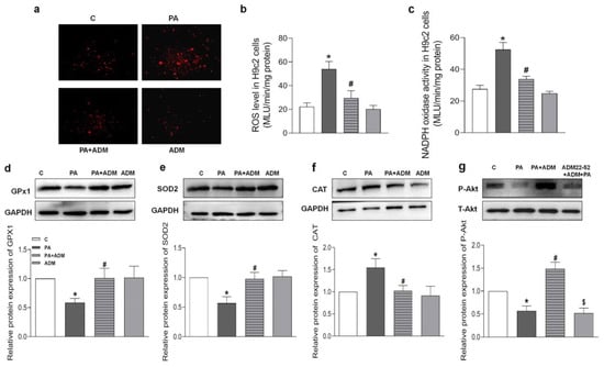 The effects of ADM on PA-induced oxidative stress and decreased Akt actiation in H9c2 cells. DHE fluorescence staining for intracellular ROS evaluation (a) in H9c2 cells, ROS level (b) and NADPH activity (c) were examined in H9c2 cells by chemiluminescence method, antioxidant enzymes including GPx1, SOD2, and CAT (d–f), and Akt phosphorylation (g) were analyzed in H9c2 cells by Western blotting method. The H9c2 cells were pretreated with 10 nM ADM for 30 min, subsequently treated by PA (200 μM) for 24 h. n = 3–6. The values are presented as the mean ± SEM. * p < 0.05 versus Control (C), # p < 0.05 versus PA, and $ p < 0.05 versus PA+ADM.