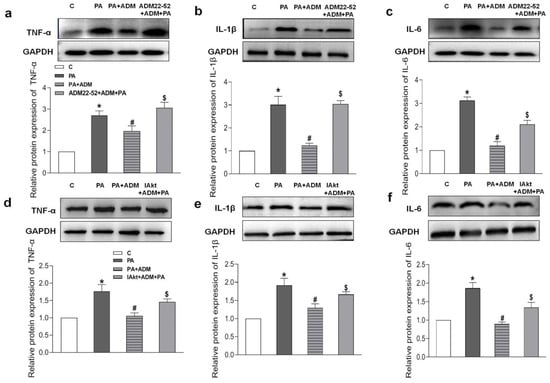 The effects of ADM receptor antagonist ADM22-52 (10−6 M, a–c) or Akt activation inhibitor A6730 (IAkt, 10 μM, d–f) on ADM’s response to pro-inflammatory cytokines TNF-α, IL-1β and IL-6 protein expressions caused by PA in H9c2 cells. ADM (10 nM) was administrated in H9c2 cells for 30 min; subsequently, cells were exposed to PA (200 μM) for further 24 h. ADM22-52 or A6730 was added 30 min before ADM application. n = 3–5. The values are presented as the mean ± SEM. * p < 0.05 versus Control (C). # p < 0.05 versus PA, and $ p < 0.05 versus PA+ADM.
