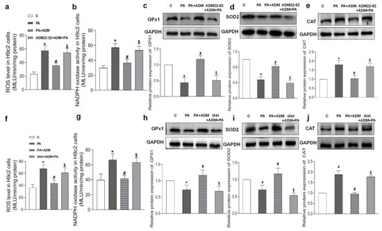 Since ADM in vitro attenuated the inflammatory response [20,21], it is speculated that ADM application may exert a beneficial effect on PA-caused oxidative stress in cardiomyocytes. The results in Figure 7a–c show that the increased ROS level and NADPH oxidase activity caused by PA were notably reduced after ADM treatment in H9 c2 cells, demonstrating the antioxidant effects of ADM in vitro. Moreover, PA-treated H2 cells showed reduced GPx1 and SOD2 protein expressions, and increased CAT expression, but the exogenous ADM pretreatment restored their protein expressions to normal levels in PA-stimulated H9c2 cells (Figure 7d–f), which further confirmed that ADM effectively improved oxidative stress.