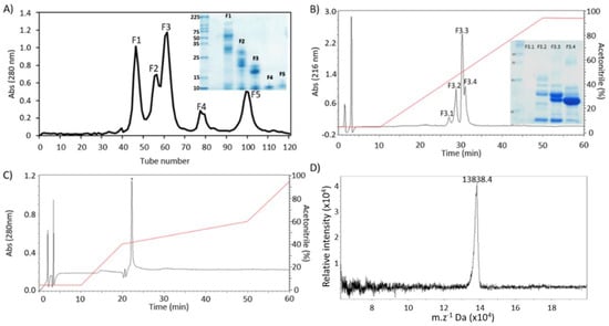 Next, the peak 3 (F3) was applied onto a C18 column (Xterra MS 5 µm—4.6 × 250 mm) in HPLC (Waters e2695). The sample was dissolved with 0.1% TFA:water (v:v) and the elution was performed using a linear concentration gradient of 5–95% of solvent B (acetonitrile + 0.1% TFA) for 60 min at a flow rate of 1 mL·min−1. The protein profile was monitored at 216 nm. The four peaks obtained from F3 separated in Xterra MS 5 column were named F3.1 to F3.4.