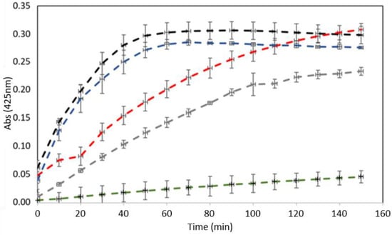 Enzymatic activity of BmPLA2 incubated with specific substrate (4N3OBA). Legend color: BSA, negative control (green); commercial PLA2 (gray); B. moojeni crude venom (black); peak F3 from Sephacryl S-100 (blue); and BmPLA2 (red).