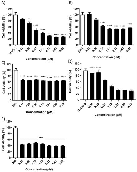 Assay of cellular viability investigating the effects of BmPLA2 on cancer and healthy cells. (A) Healthy human fibroblast cell line (MRC-5); (B) Microglia cell line; (C) Mucoepidermoid carcinoma of the lung (NCI-H292); (D) Human colorectal cancer cell line (Caco-2); (E) Human rhabdomyosarcoma cells (RD). All cell lines were treated with BmPLA2 (9.25, 4.62, 2.31, 1.15, 0.57 and 0.28 µM) for 24 h. The viability was determined using MTT reagent. All data were expressed as mean ± S.E.M and procedures were carried out in duplicate. **** means differences between the groups were considered statistically significant.