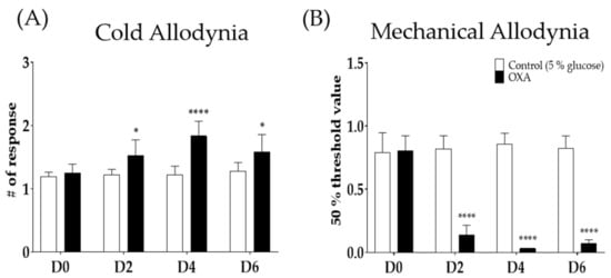 Oxaliplatin (Sigma Aldrich, St. Louis, MO, USA) was dissolved in a 5% glucose solution at a concentration of 2 mg/mL, as in our previous study [29]. Oxaliplatin was administered intraperitoneally at a dose of 6 mg/kg to mice. The control group was injected with the same amount of 5% glucose. To assess whether oxaliplatin administration could significantly induce cold and mechanical allodynia in mice, behavioral tests were conducted before (baseline), two (D2), four (D4), and six (D6) days after its injection (Figure 1A,B). All experiments were conducted on day four when cold and mechanical allodynia were strongly induced compared to control.